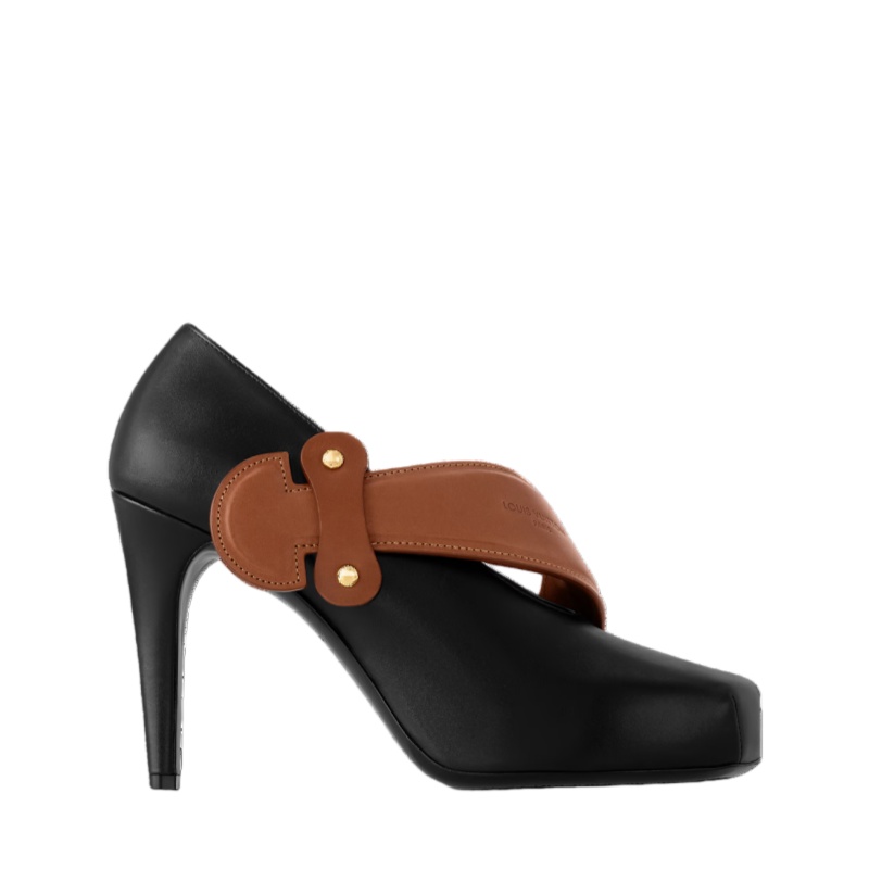 The Legacy pump in smooth calf leather was seen on the runway at the Louis Vuitton Spring-Summer 2025 show. This fashion-forward style is characterized by its distinctive strap, inspired by trunk handles and embellished with gold-toned studs, referencing the House's travel heritage. A bold square toe, integrated platform and high heel complete this design.