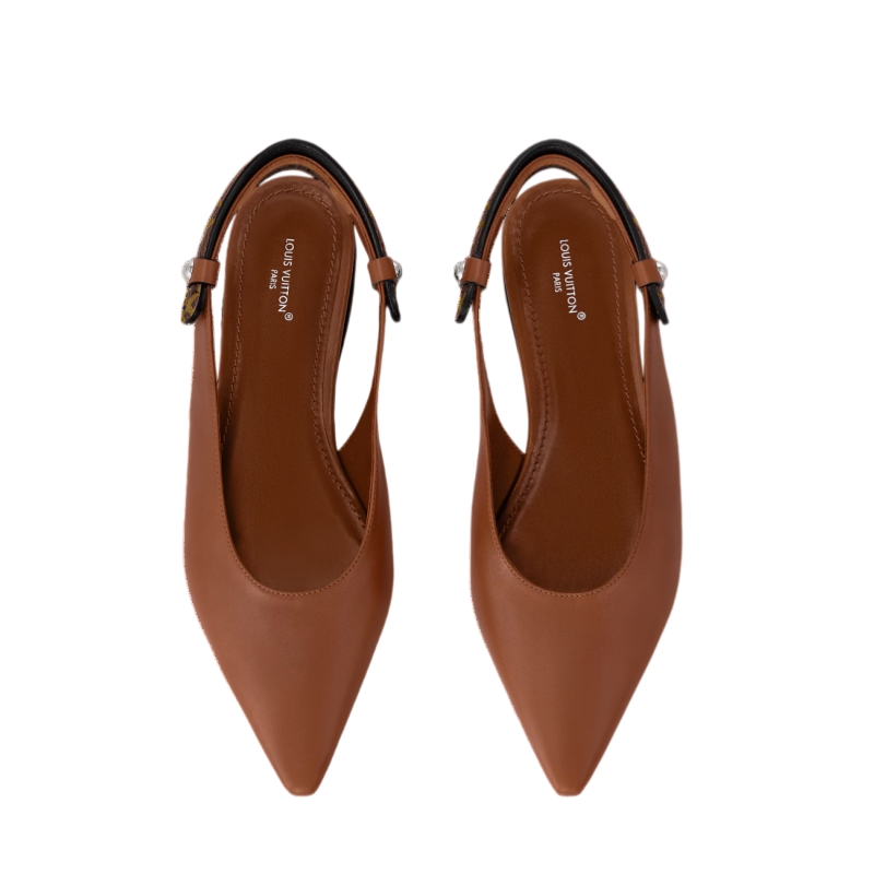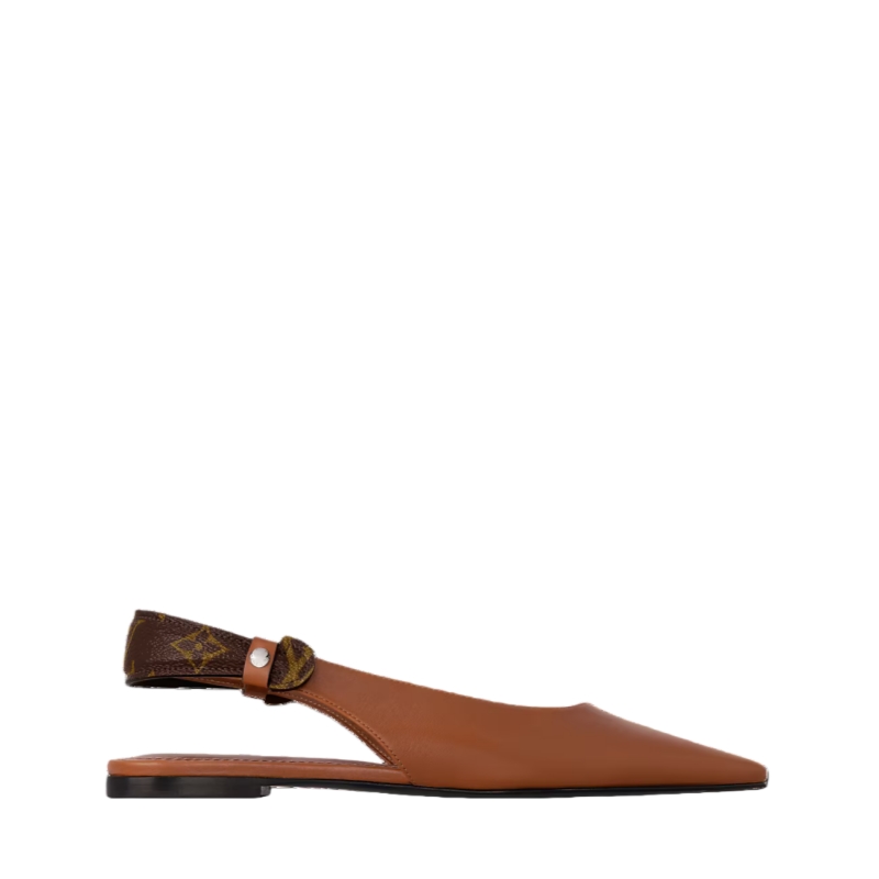 The Legacy slingback ballerina in smooth calf leather is a sophisticated style inspired by the House's travel heritage. Its key detail is a back strap in Monogram canvas, which is shaped like a trunk handle and embellished with engraved metal studs. This feminine ballet flat has a pointed toe and a fine leather outsole.