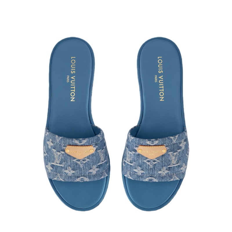 The Lily flat mule is a casual-chic style in emblematic Monogram denim. It features a wide front strap, which is signed with a Louis Vuitton-embossed natural leather label and a gold-toned stud, referencing the leather goods collection. The supple leather outsole has a rubber insert for enhanced comfort.