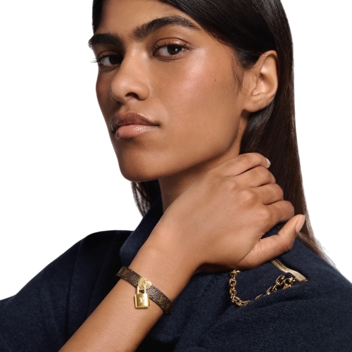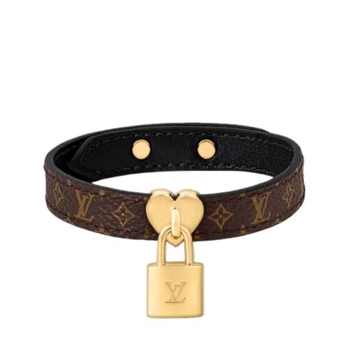 The creative design of the Lock Me In Love bracelet is a celebration of the universal theme of eternal love. Its broad Monogram leather band is accented by an LV padlock suspended from a precious heart in gleaming gold-tone metal. Worn alone or with other bracelets, this on-trend accessory brings a stylish signature touch to any look.