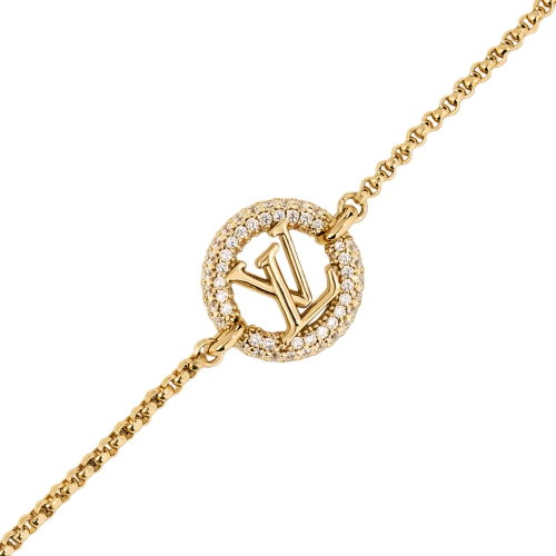The Louise By Night bracelet features a delicate link chain and a bold LV Circle accent with a sparkling border. It has an adjustable length and is finished with a smaller LV Circle charm at the end of the chain. The Louise By Night Collection was created to bring even more sparkle to the House's iconic signature.