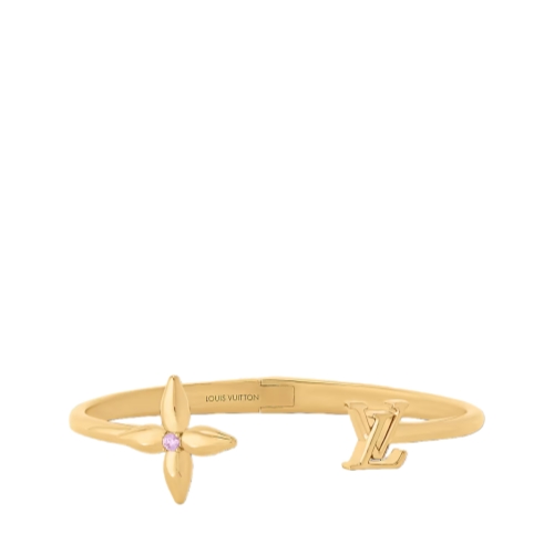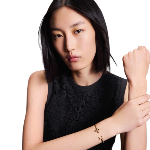 The enchanting Louisette Signature bracelet modernizes two of the House’s best-known emblems with a glint of eye-catching radiance. Its open design, crafted in gleaming gold-finish metal, pairs the LV Initials with a pointed Monogram Flower enhanced by a sparkling crystal in the center. An on-trend bracelet that emanates feminine elegance.