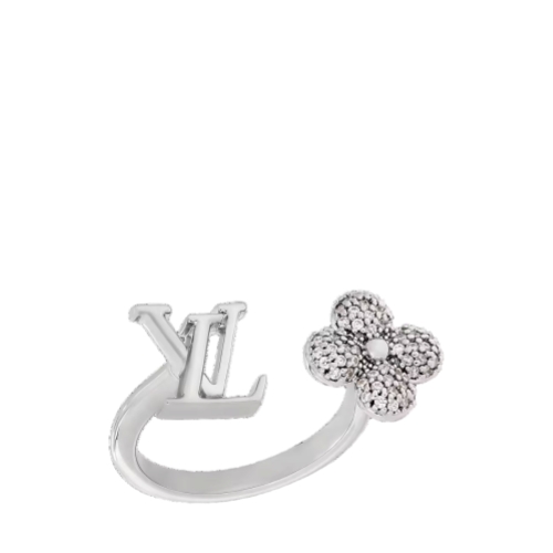 The Louisette Signature Strass ring showcases two of the House’s most beloved icons in a sophisticated, dazzling design. Its radiant palladium-colored metal band is adorned with the LV Initials on one side and a rhinestone-studded Monogram Flower on the other. This elegant, ultra-feminine ring is perfect for the festive year-end season.