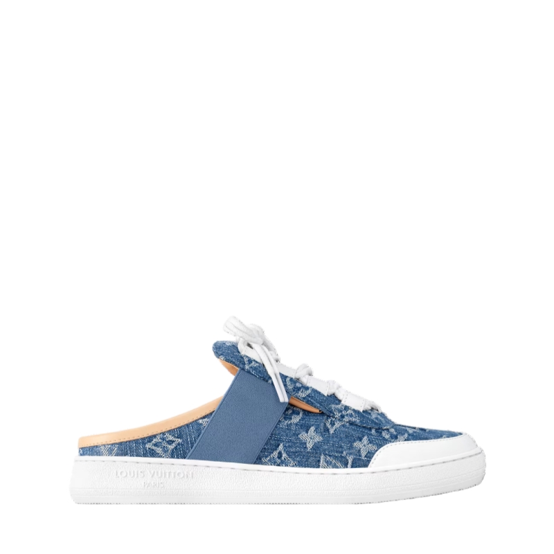The Lous open-back sneaker is a relaxed, on-trend style, which this season is interpreted in Monogram denim. This model is notable for its tonal elastic inserts, which allow it to be slipped easily on and off. The upper features thick double laces and trim in natural leather, an emblematic material referencing Louis Vuitton leather goods.