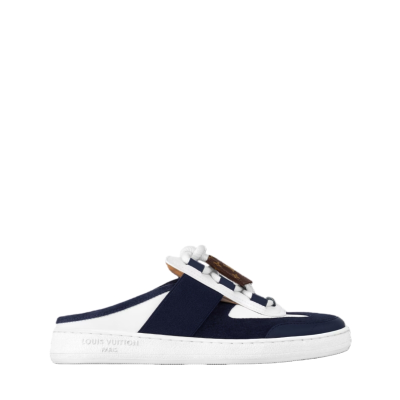 The Lous open-back sneaker is given a chic, nautical twist in suede calf leather. This model is notable for its thick, crisscrossing laces, which are embellished with a key bell in Monogram canvas, referencing Louis Vuitton Leather Goods. Discreet elastic inserts allow the sneaker to be slipped easily on and off.