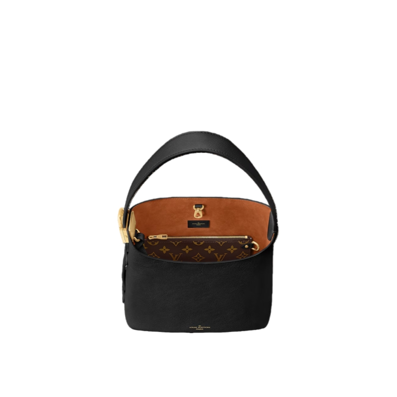 The supple Low Key Hobo PM bag is made from smooth calfskin with suede-calfskin lining. Its unique design includes a single strap that adjusts with a padlock buckle. The interior includes a removable zipped pouch in Monogram canvas to keep things organized. This bag can fit a compact wallet, large smartphone, keys, and other smaller belongings.