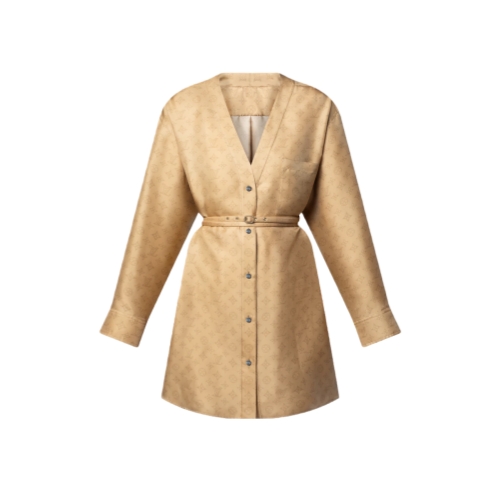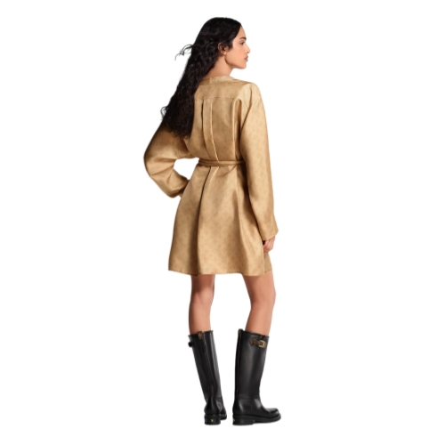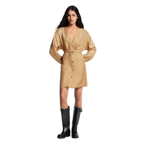This dress has elevated appeal in soft, lustrous silk twill in a warm earthy shade featuring a subtle allover Mahina Monogram motif. It is cut in a breezy long-sleeved mid-length shape with a button front that fastens to a clean V neckline, while a slim eyelet belt accentuates the waist.