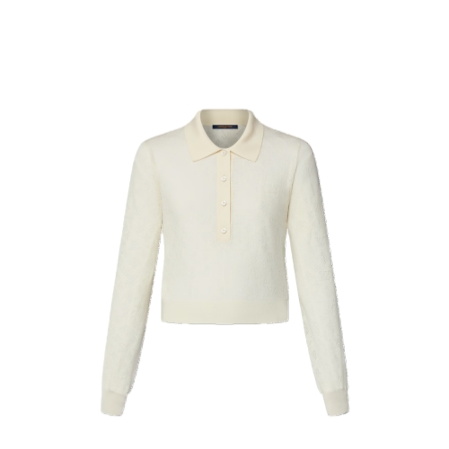 This polo top is elegantly uplifted in a fine wool-blend knit in a fresh seasonal shade. It is discreetly signed all over with a delicate pointelle Mahina Monogram motif, while ribbed hems frame the look. It is crafted in a cropped fit with long sleeves and a sporty flat collar and buttoned neckline.