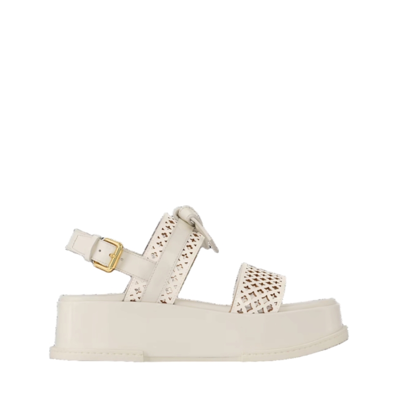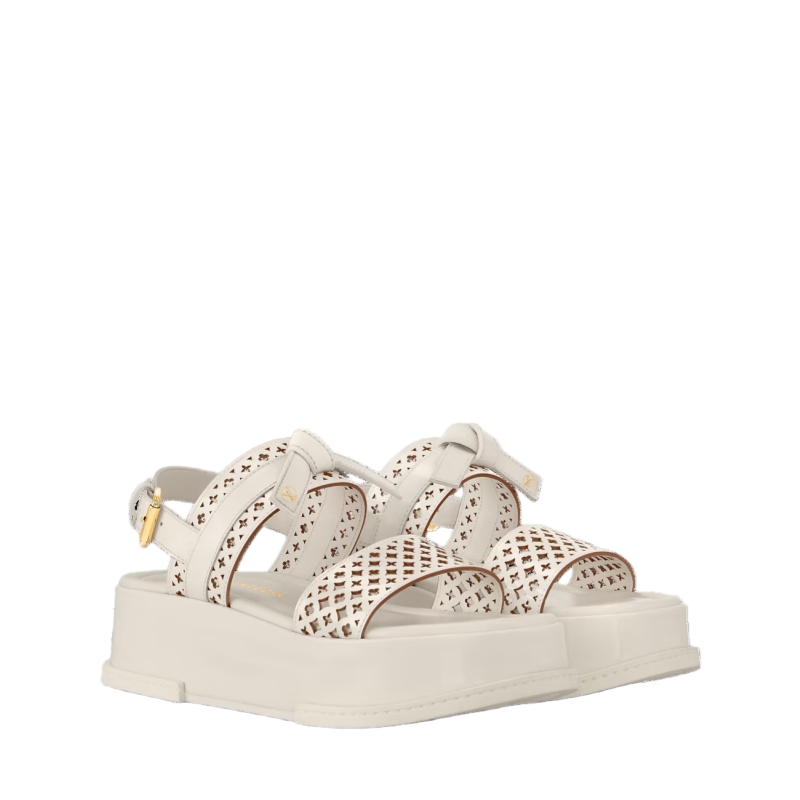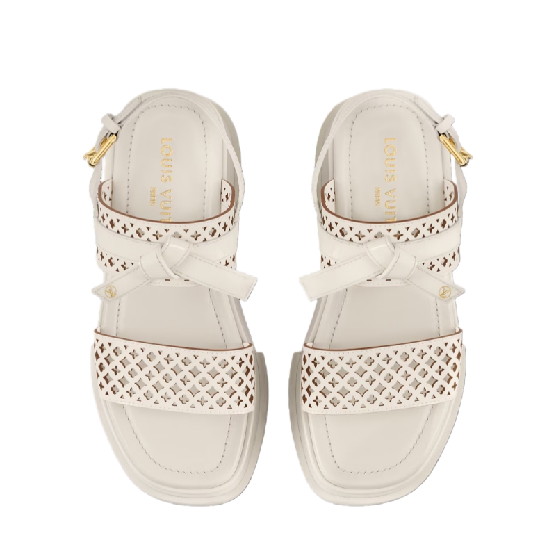 This interpretation of the Maya comfort sandal comes in patent calf leather with delicate Monogram Flower perforations. One of its straps is further embellished with a belt-style knot, which is signed with an LV Circle accessory. This model's comfortable flatform is also covered in patent leather for a refined look.
