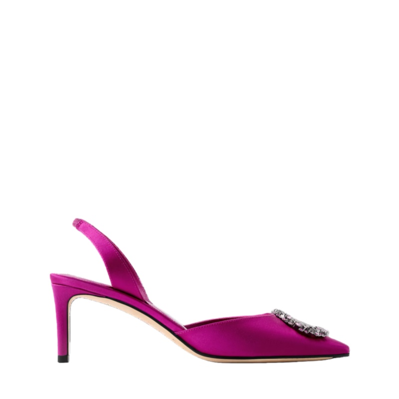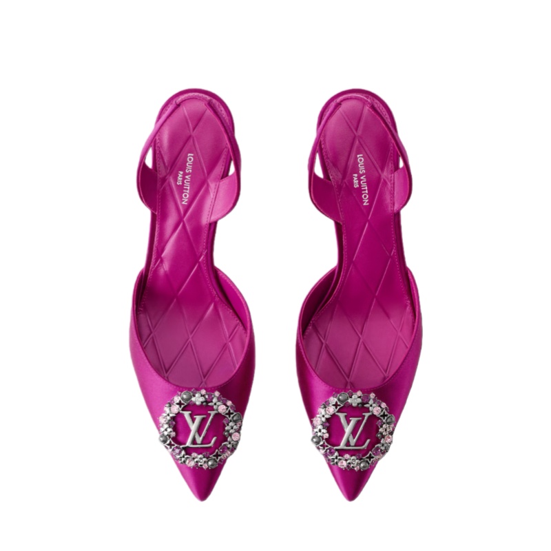 The Met slingback pump combines a satin upper with an intricate LV Initials accessory in silver-toned metal encrusted with rhinestones and flowers, a nod to the House's iconic Monogram Flowers. This sophisticated model comes on a slender, mid-height heel and features an elasticized back strap for easy fitting. It is finished with a fine leather outsole.