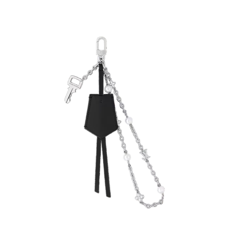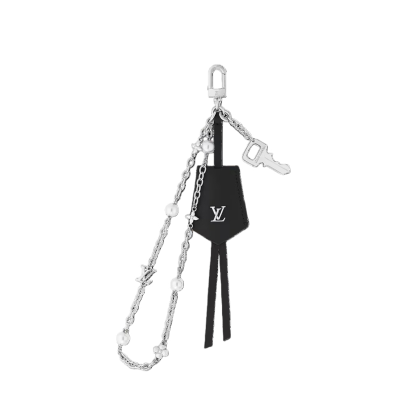 The fun and functional Midnight Pearls Stacking bag charm reimagines the House’s iconic emblems with a contemporary twist. A palladium-colored chain adorned with the famous Monogram Flowers and Initials is paired with a leather LV keybell and palladium-colored key. This versatile accessory adds a touch of vibrant flair to a handbag.