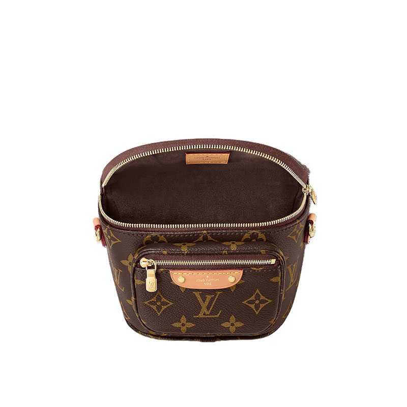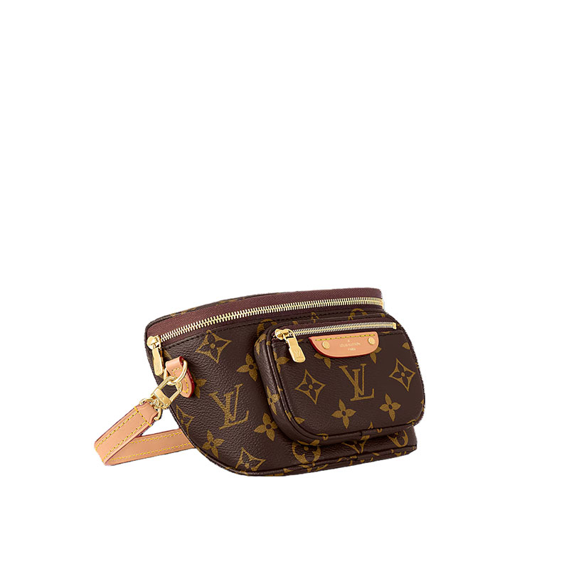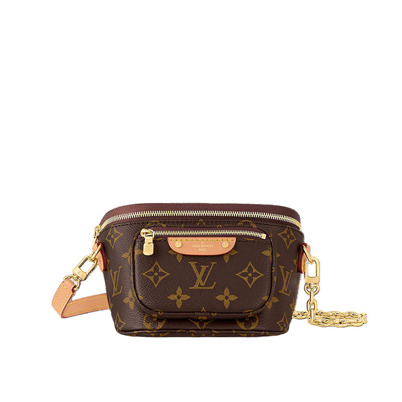 The Mini Bumbag in Monogram canvas is Louis Vuitton's feminine interpretation of the on-trend bumbag format. Designed for versatility, it features a removable, adjustable strap in the House's emblematic natural leather, as well as a removable gold-tone chain, which can be functional or decorative. The bag has a zipped main compartment and a zipped front pocket with an embossed leather tag.
