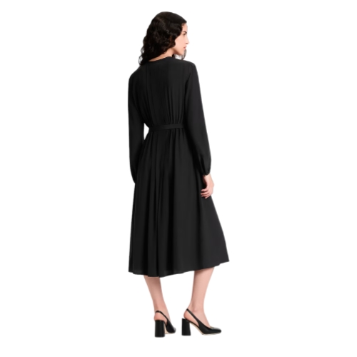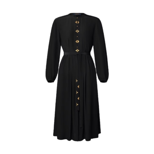 This elegant dress is crafted from fluid silk crepe de chine in a mid-length silhouette with a clean neckline and romantic bishop sleeves. Crisp pleats add structure to the front and back, while the chest and tone-on-tone belt are trimmed with metallic Monogram accents for a sophisticated signature finish.