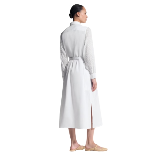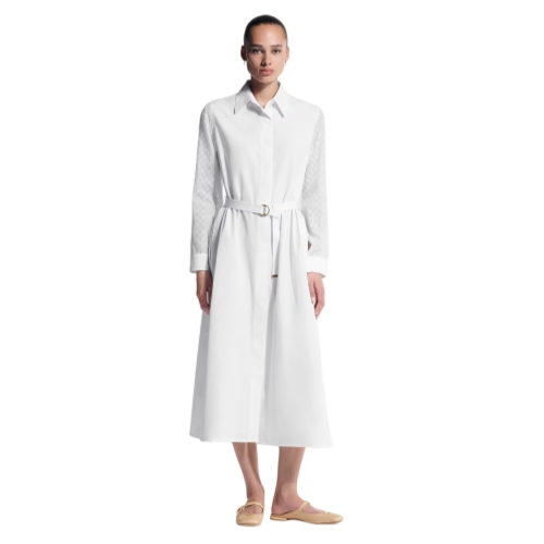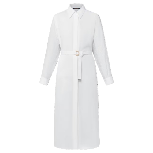Subtle detailing elevates this crisp shirt dress with a chic finish. It is tailored from cotton poplin in a full-length shape with a smart collar and a hidden button tab for a clean, minimal silhouette. The long sleeves are discreetly highlighted with tone-on-tone Monogram fil coupé, while the waistline is defined with a slim D-ring belt.
