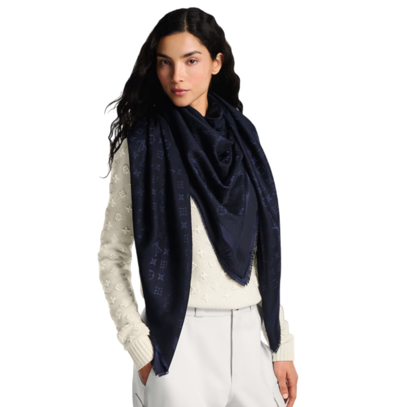 The Monogram Classic shawl is a timeless style celebrating one of the House's most iconic signatures. A tone-on-tone allover Monogram pattern decorates the piece with a subtly shiny effect. The soft wool and silk blend offers a warm and elegant finish, while a fringed hem completes the design.
