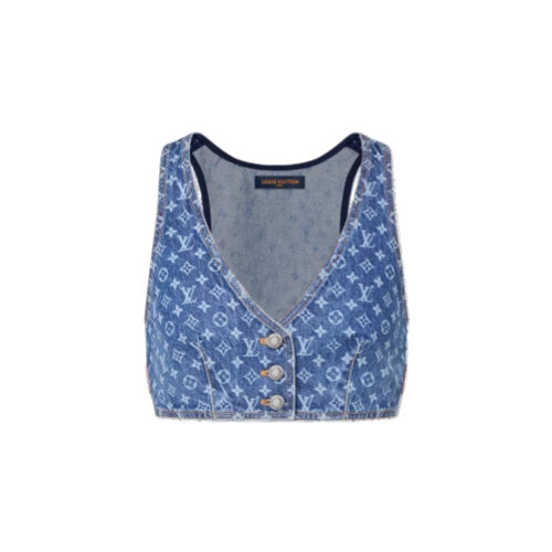 This crop top is cut in a chic form-fitting V-neck shape from denim featuring an allover Monogram motif for a casual signature look. Contrasting yellow stitching emphasizes the structure, while three Louis Vuitton-engraved buttons trim the chest. The fit can be adjusted thanks to natural leather tabs at the back.