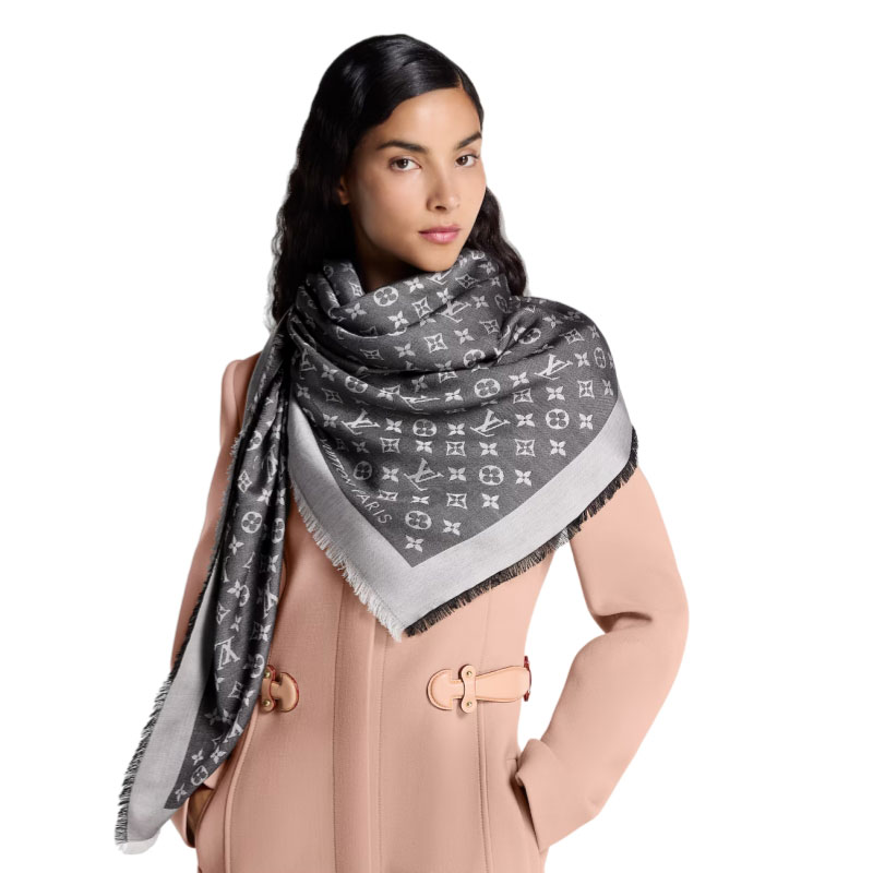 Ideal for everyday use, this luxuriously soft Monogram Denim shawl is subtle and very feminine. Entirely weaven in jacquard, it features the Louis Vuitton signature and the Monogram pattern.