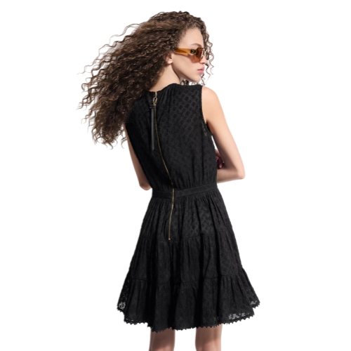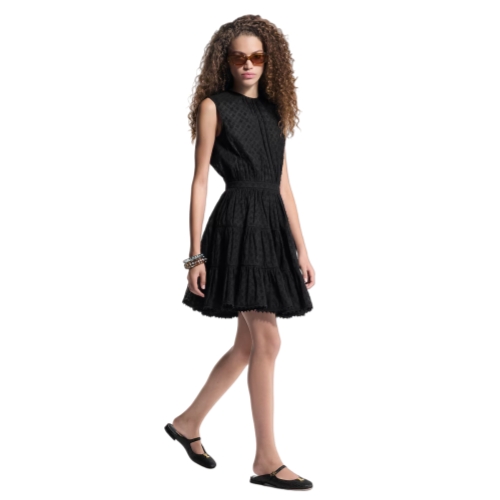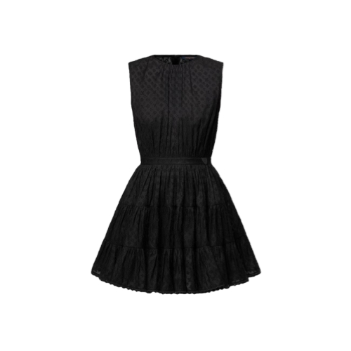 This quintessential little black dress is crafted from an airy cotton-silk blend that is discreetly signed allover with the Monogram motif in fil coupe, while a Monogram Flower trim highlights the hem. The fitted top is offset by the volume of the A-line skirt, which is emphasized with gathered tiers. An exposed golden zipper fastens the back.