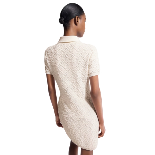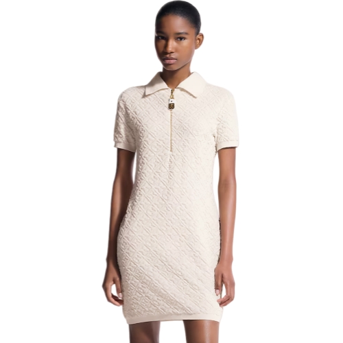 This chic polo dress is crafted from plush cotton-wool blend toweling that is discreetly signed all over with Monogram Flowers in relief and finished with ribbed hems. It is crafted in a casual short-sleeved shape with a sporty flat collar and a golden zipper on the chest, which is trimmed with a Monogram canvas pull.