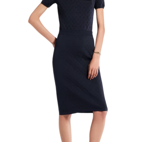 This pencil skirt is spun in a versatile mid-length shape from a flexible silk-blend knit that skims the figure for an unfussy, fitted silhouette. Presented in a timeless shade, the iconic Monogram motif features as a graphic allover jacquard. The elasticized waistband and hemline are ribbed for a fresh, sporty finish.