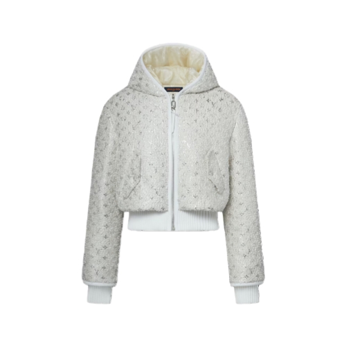 Sparkly and sporty, this hooded jacket is crafted from this season’s signature tweed in a soft, textured finish with the iconic Monogram motif subtly woven in shimmering lurex. The cuffs and cropped waistline are trimmed with tonal ribbing for a trim fit, while a silver-toned zipper fastening and snap-button side pockets complete the look.