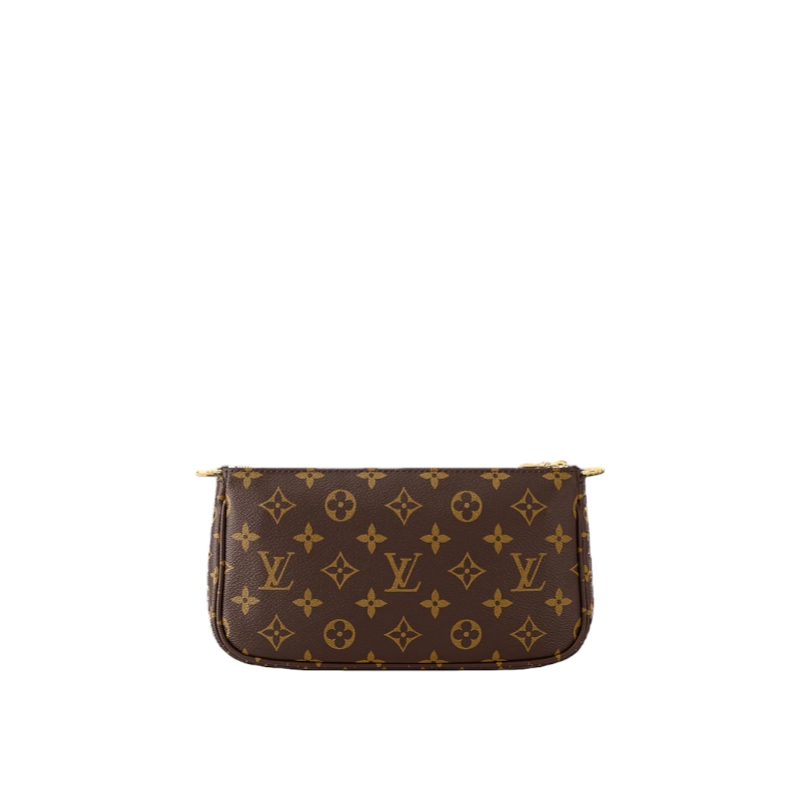 The Multi Pochette Accessoires is a hybrid cross-body bag with multiple pockets and compartments that brings together a Pochette Accessoires, a Mini Pochette Accessoires and a Round Coin Purse. Fashioned from Monogram canvas with a mini Monogram pattern on the sides of the two pochettes, it has both a removable gold-tone chain and an adjustable Louis Vuitton inscribed Jacquard strap for multiple carrying options.