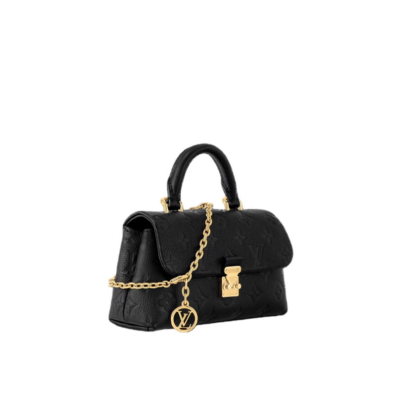 The Nano Madeleine in Monogram Empreinte leather is a miniaturized version of the emblematic Madeleine bag. It is adorned with an iconic S-lock closure and a removable chain embellished with an LV Circle charm. The versatile design is roomy enough to store everyday essentials and can be worn cross-body, over the shoulder or carried by hand.