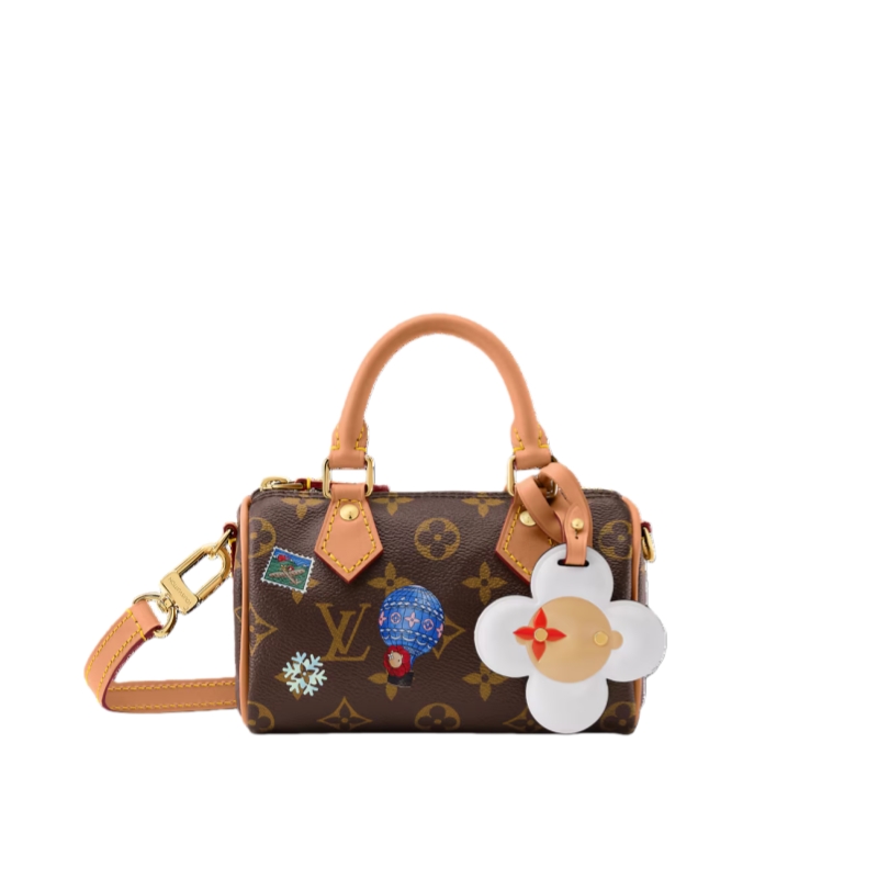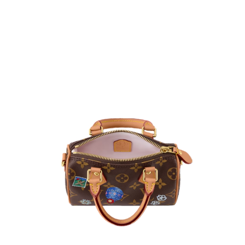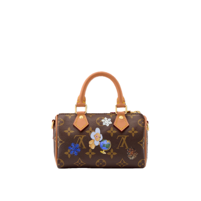 This colorful edition of the Nano Speedy stars the House’s iconic mascot Vivienne. Crafted from signature Monogram canvas, the playful design is decorated with illustrations and includes a Vivienne charm. It is trimmed with leather and is finished with gold-toned hardware for a sophisticated finishing touch.