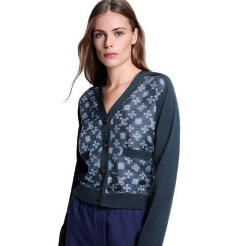 Sophisticated signatures refresh this cardigan for elevated everyday wear. It is spun from a fine wool knit in a comfortable straight shape with trim patch pockets on either side. The front is highlighted with this season’s elegant Art Nouveau-inspired Monogram motif printed on silk, while Monogram canvas buttons complete the look with a classic House touch.