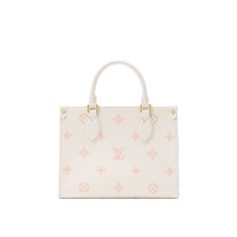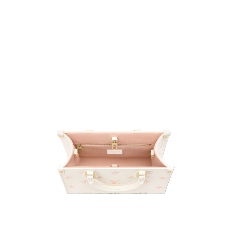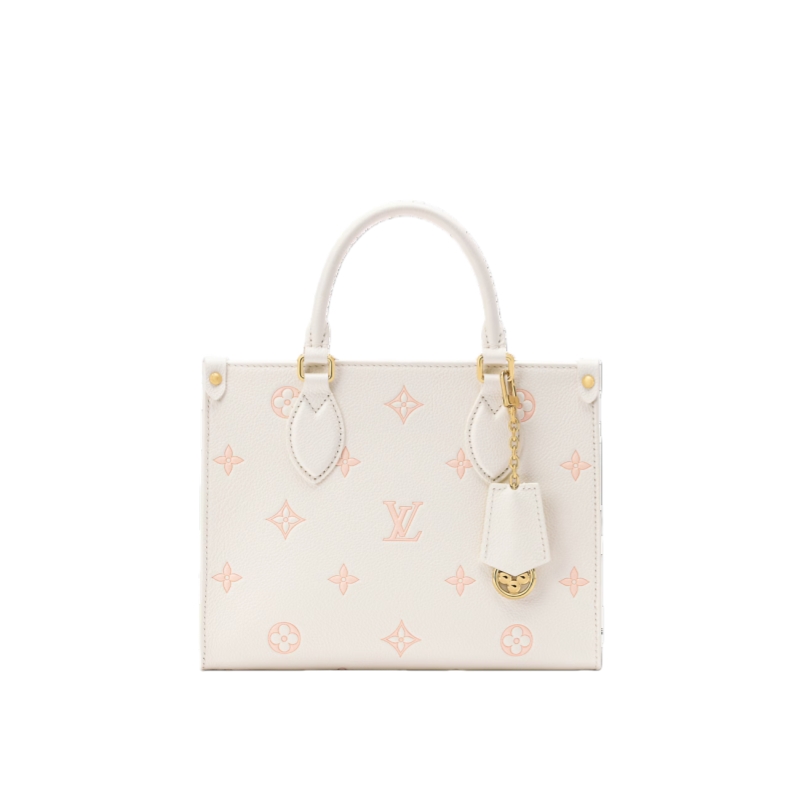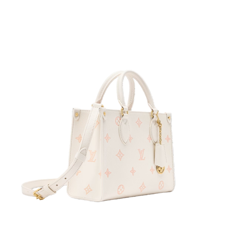 Updated for the season, this OnTheGo PM is offered in a chic and contemporary bi-color palette of Milky White and Peach. It is crafted from signature Monogram Empreinte leather and adorned with light gold-toned hardware, which includes a decorative charm. Sized to fit the essentials, this elegant design can be worn multiple ways and includes a textile zipped pouch inside.
