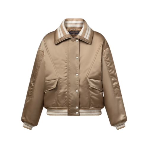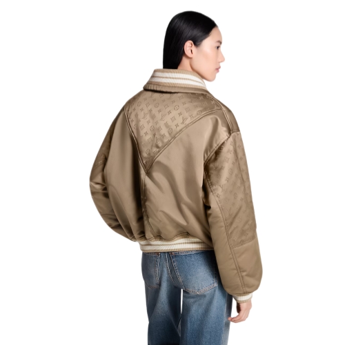 This jacket is sporty and cozy in a classic bomber cut with padding for elevated warmth. It is crafted from lustrous nylon satin in a chic seasonal shade with subtle Monogram accents and tonal striped ribbing highlighting the collar, cuffs and waistband. Visible seam details and large flap pockets complete the look with a structured feel.