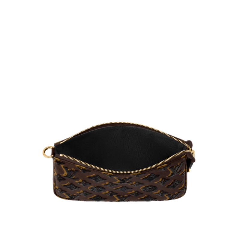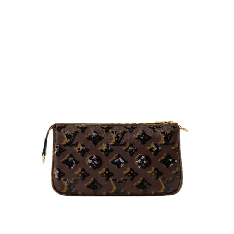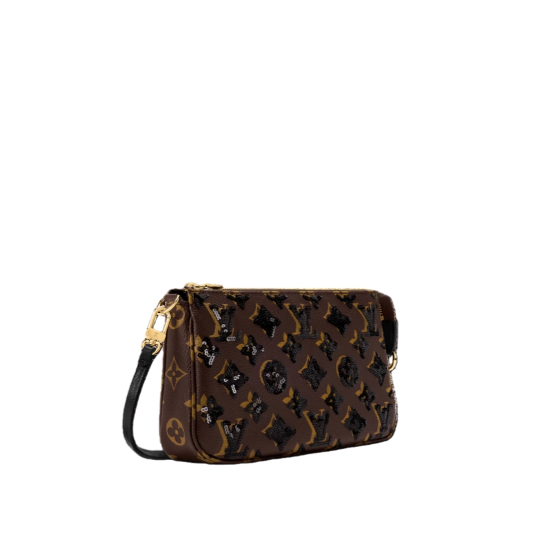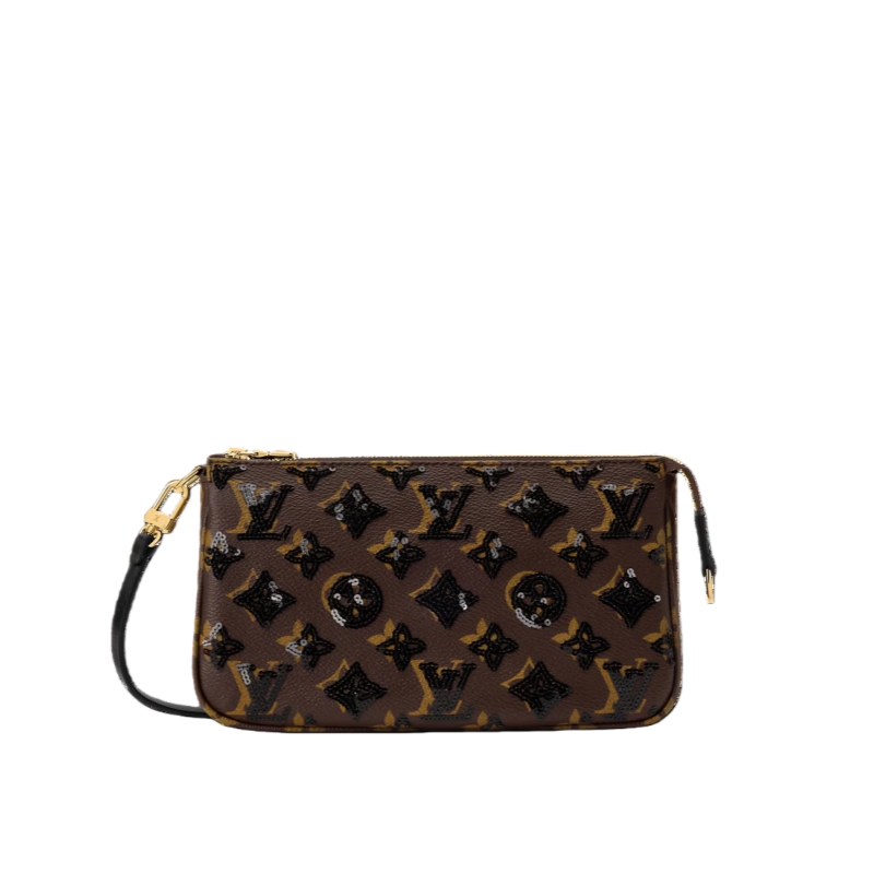 Offered in a versatile colorway that complements both day and evening looks, this Pochette Accessoire is a timeless choice for any wardrobe. It is crafted from Monogram canvas adorned with sequins and is trimmed with smooth tonal leather. The gold-toned zipper adds a touch of detail.