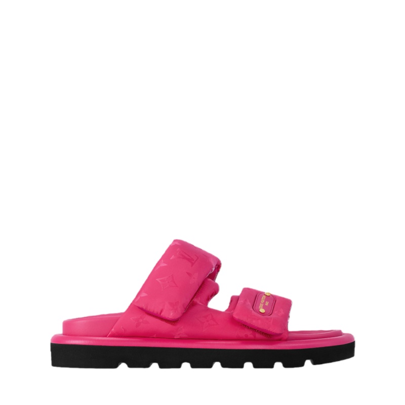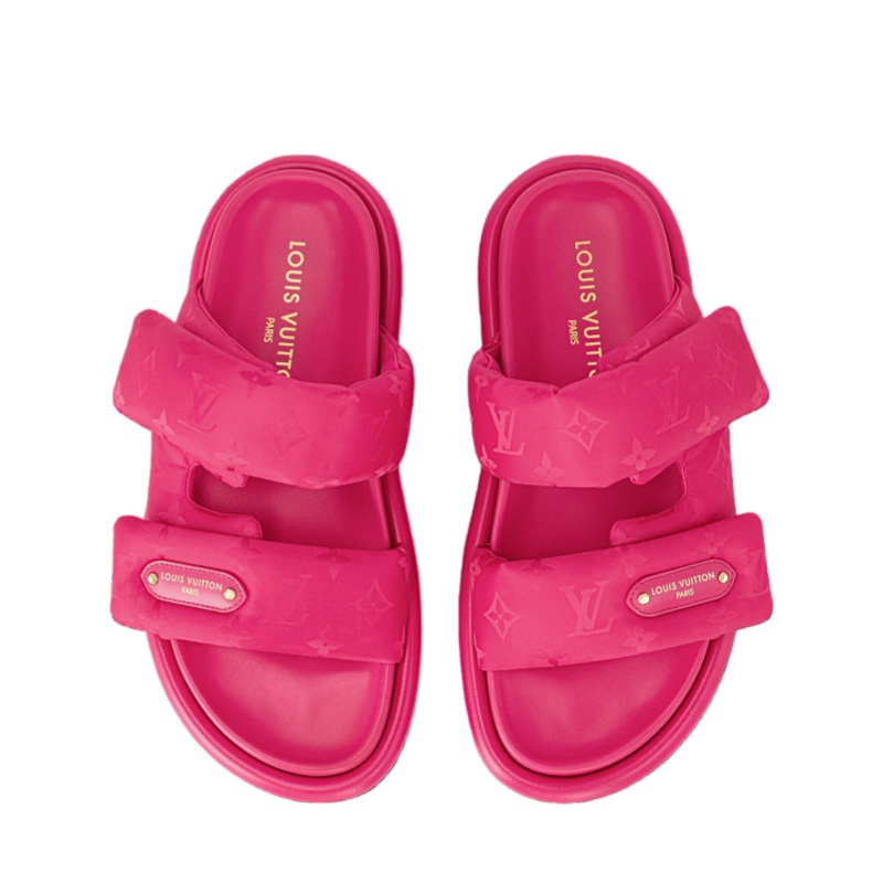 The Pool Pillow comfort mule comes in technical nylon with a tone-on-tone Monogram pattern. This model is characterized by its two cushiony straps, which are adjusted with velcro and lined with leather, its anatomic footbed and its lightweight micro outsole. The front strap is embellished with a Louis Vuitton-embossed leather label and two tiny studs.