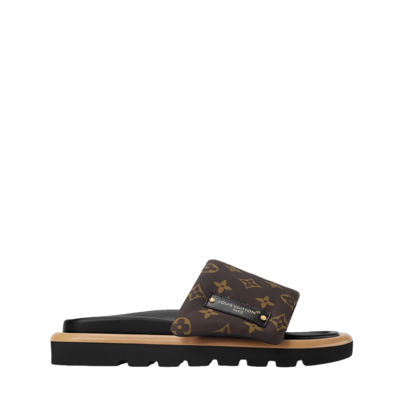 The Pool Pillow flat comfort mule features a padded front strap in Monogram nylon. The strap is adjusted with velcro and embellished with a leather label embossed in gold with the Louis Vuitton signature. Designed for optimum comfort, this model has a padded anatomic footbed and a lightweight micro outsole.