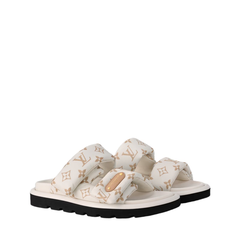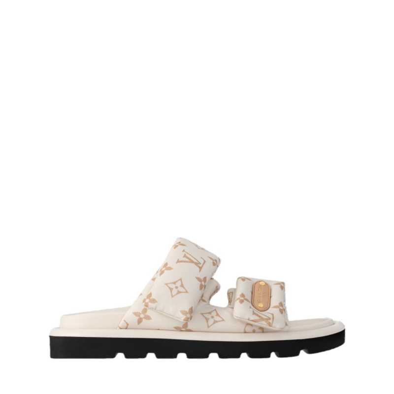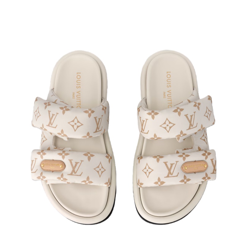 The Pool Pillow comfort mule is revisited with two padded, adjustable straps in Monogram nylon, which are lined with leather for comfort and durability. The front strap is embellished with a leather label embossed with the Louis Vuitton signature. This easy-to-wear style is finished with a comfortable anatomic footbed and a lightweight micro outsole.