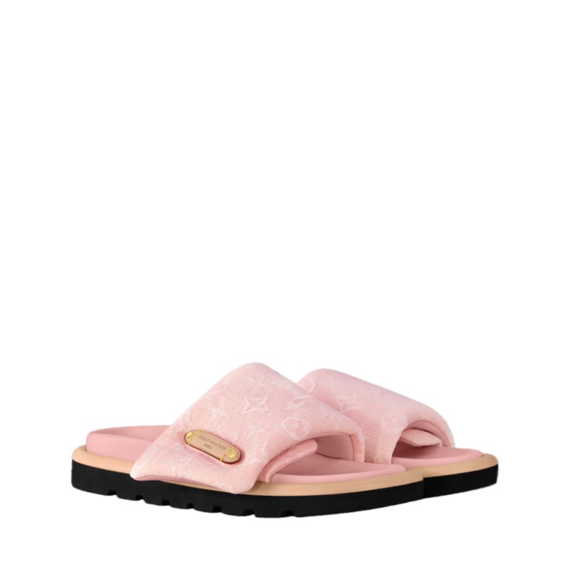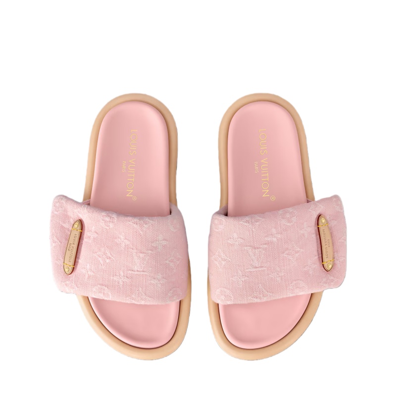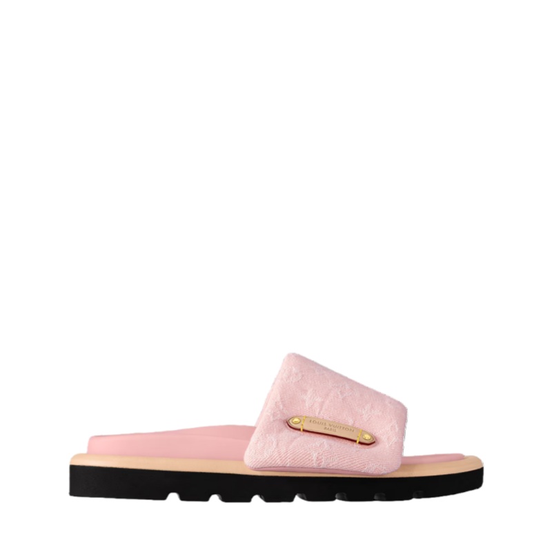 The Pool Pillow flat comfort mule is reinterpreted this season in Monogram denim. This model is notable for its padded, pillow-like front strap, which is conveniently adjusted with velcro, and its comfortable anatomic footbed. The strap is signed with an embossed label in natural cowhide leather with yellow stitching, referencing Louis Vuitton leather goods.