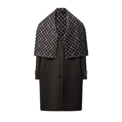 This coat is a versatile cold-weather classic in a long, loose silhouette cut from a plush double-face wool-silk blend with a graphic Monogram jacquard on the inside. The sharp V-neckline is fitted with a removable oversized scarf collar for added coziness, while the cuffs are trimmed with sleek leather tabs for a sophisticated finish.