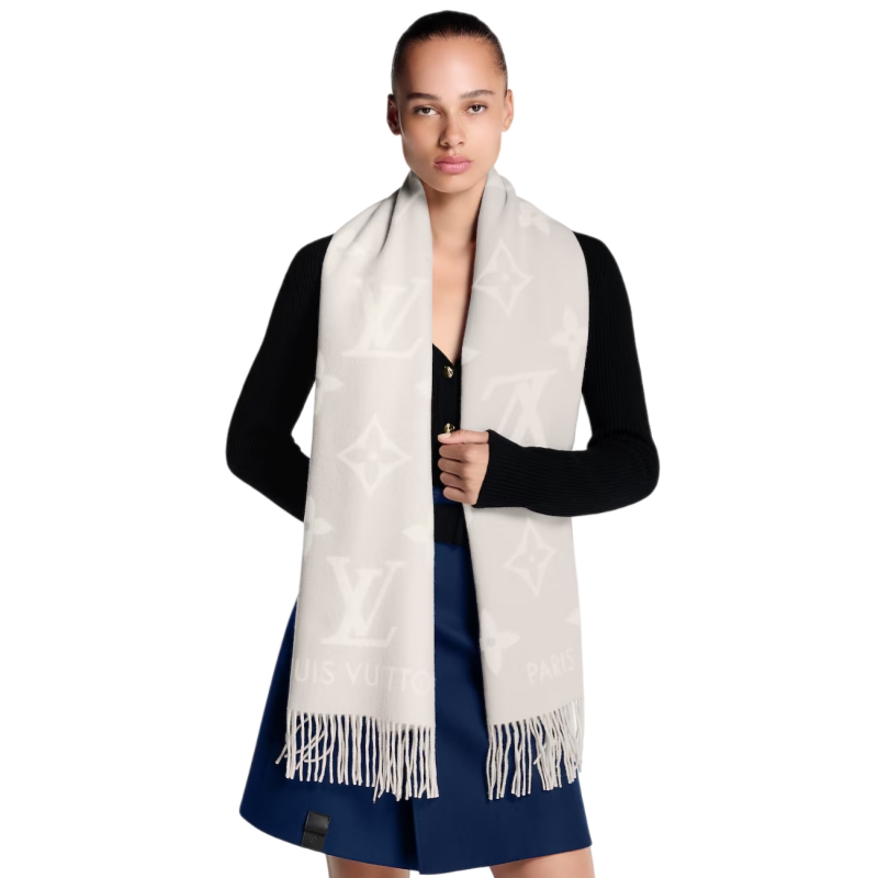 The outsized, extra-long Reykjavik scarf expresses a strong identity. A giant version of the House’s famous Monogram pattern is jacquard-woven into pure, plush cashmere, accented by a Louis Vuitton Paris signature and fine fringe at the ends. Ultra-warm and a pleasure to wear, it ensures stylish comfort and protection against the cold.