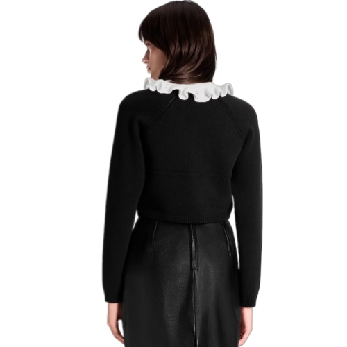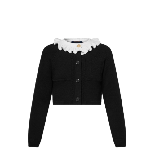 Playful proportions and discreet detailing subvert the elegant codes of this wool-blend cardigan. It is crafted in a contemporary cropped shape with delicate openwork LV Initials on the chest. The neckline is trimmed with a wide color-blocked ruffle collar for a graphic contrast, while a Monogram Flower button completes the look with a chic signature flourish.