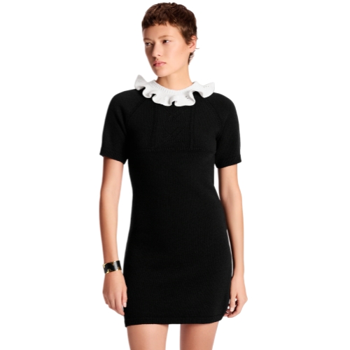 This short-sleeved dress has both elegance and edge in a form-fitting wool-blend knit detailed with delicate openwork around the bust and back. The neckline is embellished with a playful ruffled collar in a contrasting knit, which is fastened at the back with a Monogram Flower button for a subtle signature finish.