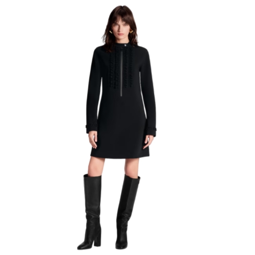 This dress has a clean, contemporary look in the House’s signature technical jersey. It is cut in an elegant silhouette with long sleeves and a lightly tapered waist. The snap-button collar and coated zipper fastening at the neckline introduce a sporty vibe, which is offset by romantic ruffled trims on the chest and cuffs.
