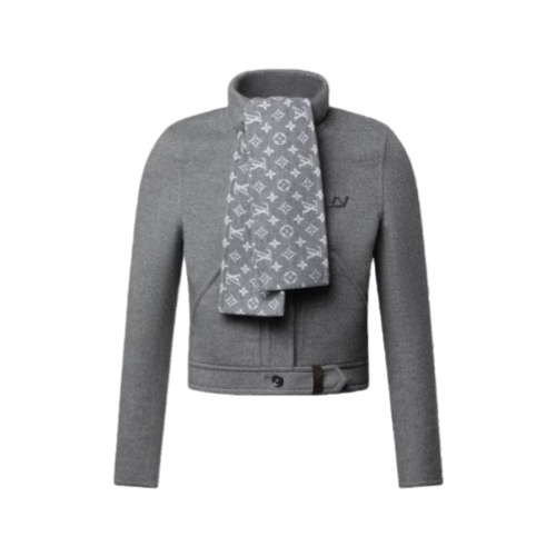 This button-up jacket has both sporty and cozy appeal in a trim, straight shape detailed with two side pockets, a belted waistline and a high collar with an integrated Monogram scarf. It is cut from a plush double-face wool-silk blend with visible seams for a structured look. The chest is signed with a sleek LV Twist charm.