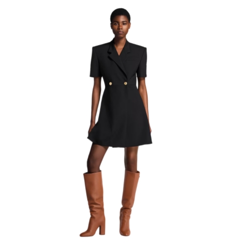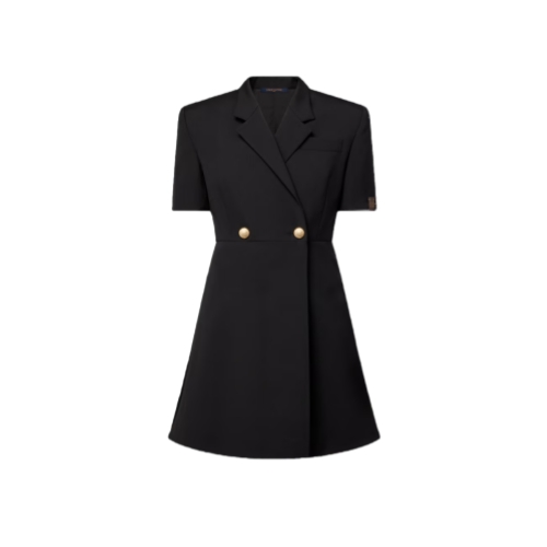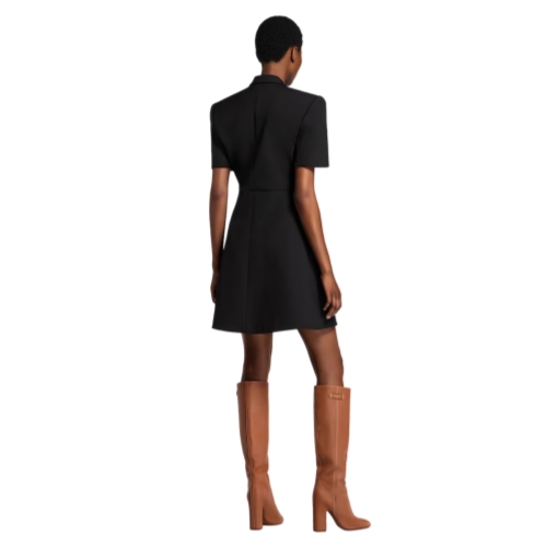 This wool twill wrap dress has a clean, tailored look in a smart short-sleeved silhouette cut with a notched lapel collar and a sharp A-line skirt. The waist is accentuated with two refined hammered golden buttons for a double-breasted effect, while a Monogram Flower tab subtly signs the left arm.