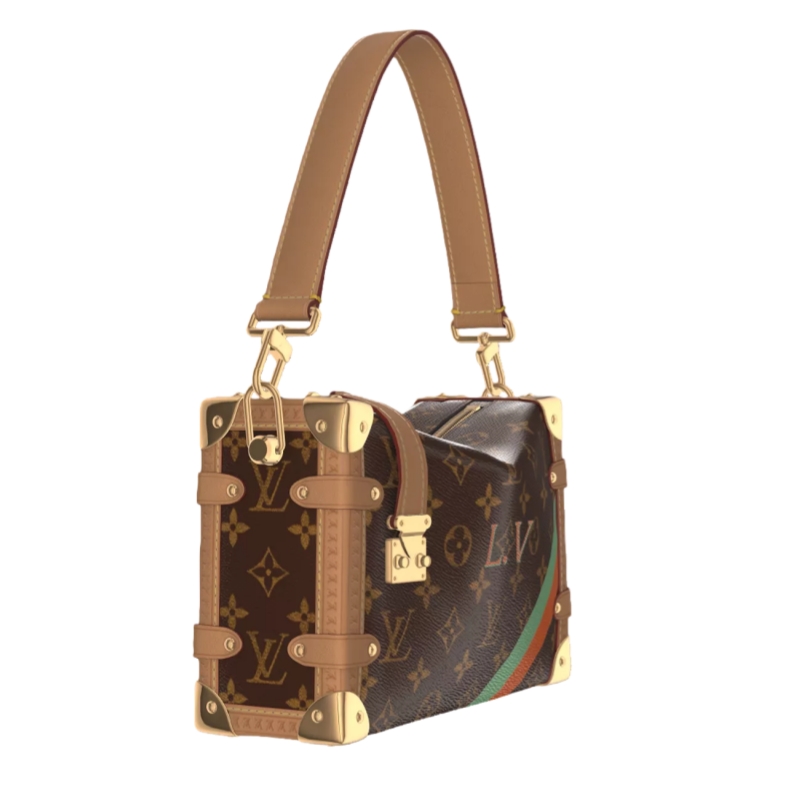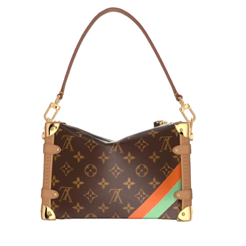 Returning to the House’s trunkmaking beginnings, Nicolas Ghesquière creates the Side Trunk MM handbag in Monogram canvas with leather trim. This edition belongs to the Mon Monogram offer with an array of customizable details, from colorful patches and stripes to personal initials. It is finished with an iconic S-lock and reinforced metallic corners in sophisticated gold-toned metal.