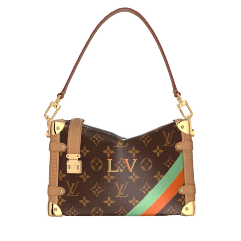 Returning to the House’s trunkmaking beginnings, Nicolas Ghesquière creates the Side Trunk MM handbag in Monogram canvas with leather trim. This edition belongs to the Mon Monogram offer with an array of customizable details, from colorful patches and stripes to personal initials. It is finished with an iconic S-lock and reinforced metallic corners in sophisticated gold-toned metal.