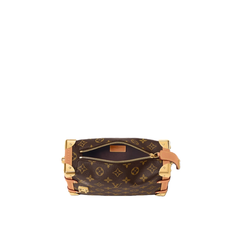 Returning to the House’s trunkmaking beginnings, Nicolas Ghesquière creates the Side Trunk MM handbag in Monogram canvas with leather trim. What strikes the eye is the singularity of the leather zip tab fitted with the iconic S-lock and the reinforced metallic corners. The wide top handle is removable as is the thin leather shoulder strap.