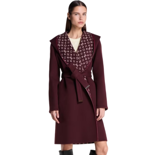 The House’s signature long wrap coat is revisited for the season in an elegant jewel tone. It is cut from a plush double-face blend of wool and silk with a graphic Monogram jacquard signing the inside. The edges are trimmed with tonal leather, while a casual self-tie belt adds definition to the waistline.