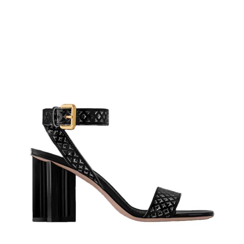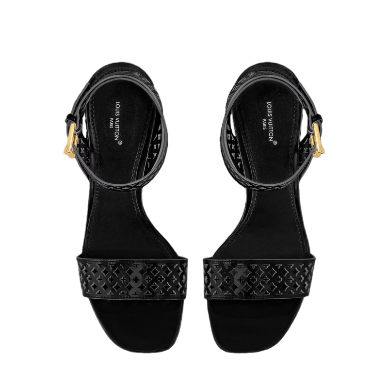 The Silhouette sandal is crafted from patent calf leather with intricate Monogram Flower perforations. This sophisticated style comes on a high heel in the shape of a Monogram Flower, a key signature of the Silhouette line. It fastens around the ankle with an engraved, gold-toned buckle.