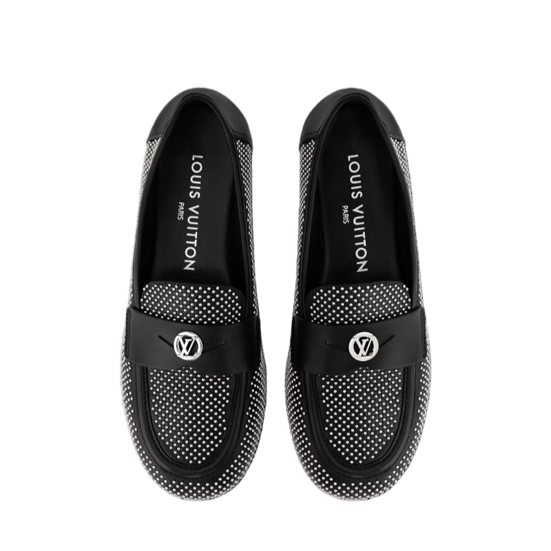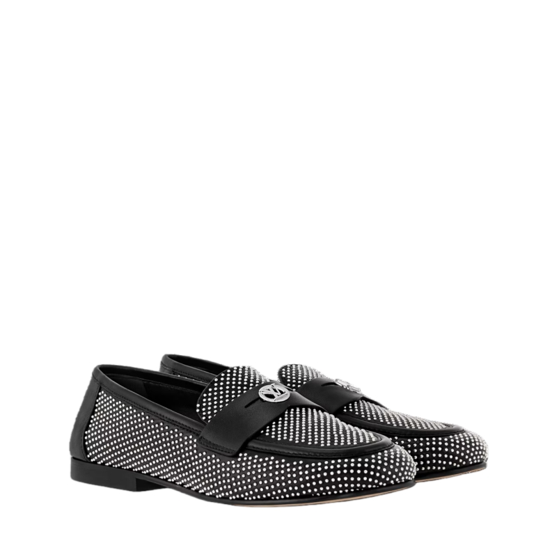 The Soho flat loafer is reinterpreted this season in supple lambskin, which is decorated with dozens of tiny, silver-toned studs. This refined model is distinguished by its sleek lines, rounded toe and cut-out strap, which is signed with an LV Circle accessory. A fine leather outsole completes this design.