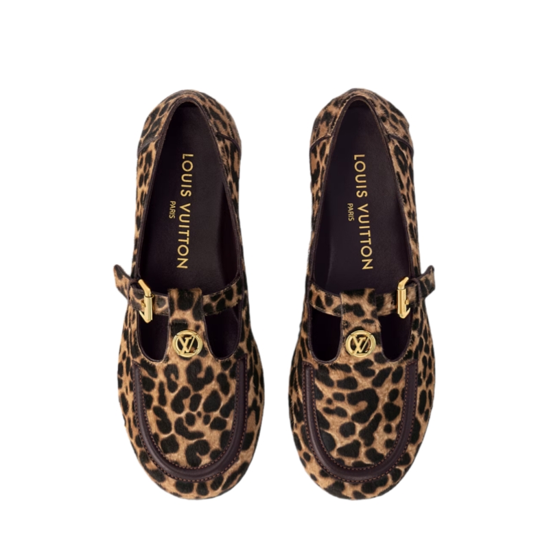 The Soho Mary Jane flat loafer comes in hairy calf leather with an eye-catching leopard print. This style is complemented by refined details, including leather trim on the vamp and an LV Circle accessory on the T-bar. The strap is adjusted with a square buckle in gold-toned metal.